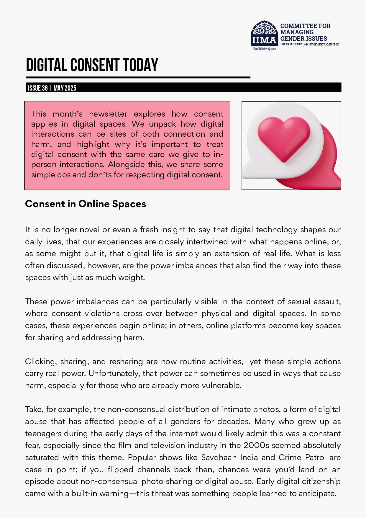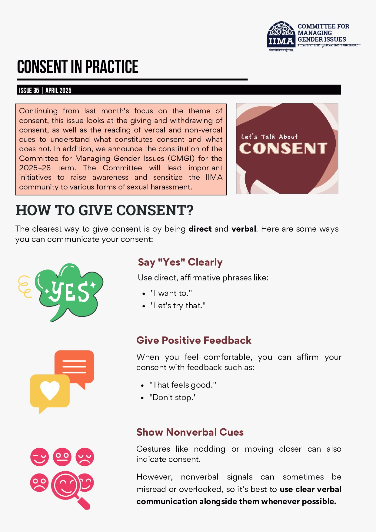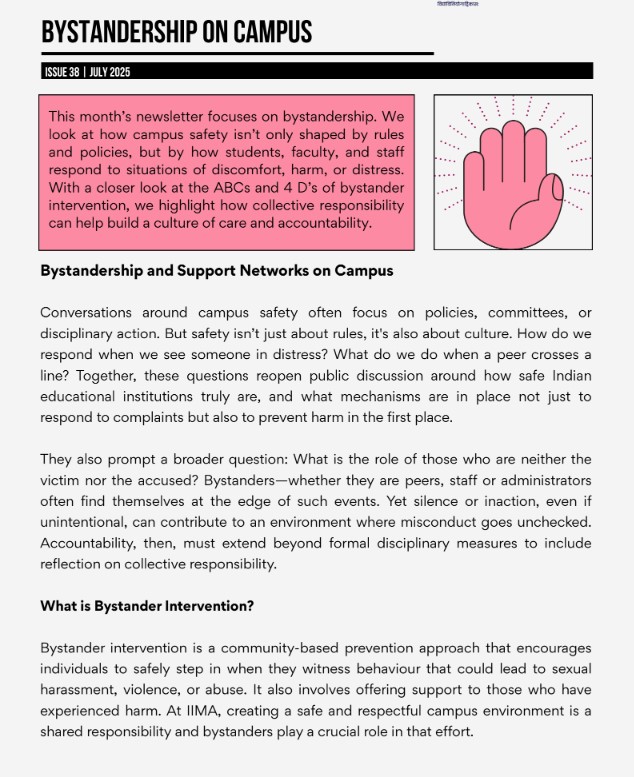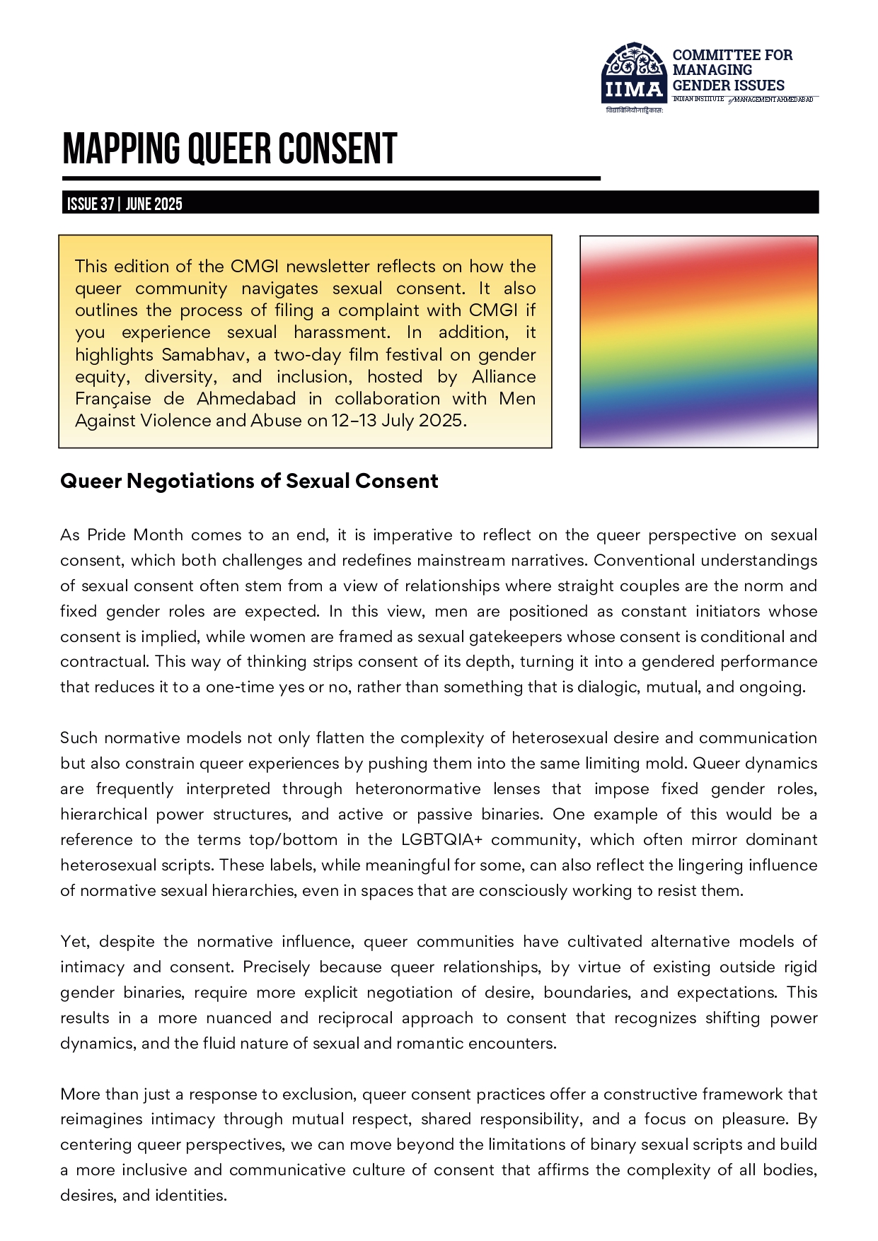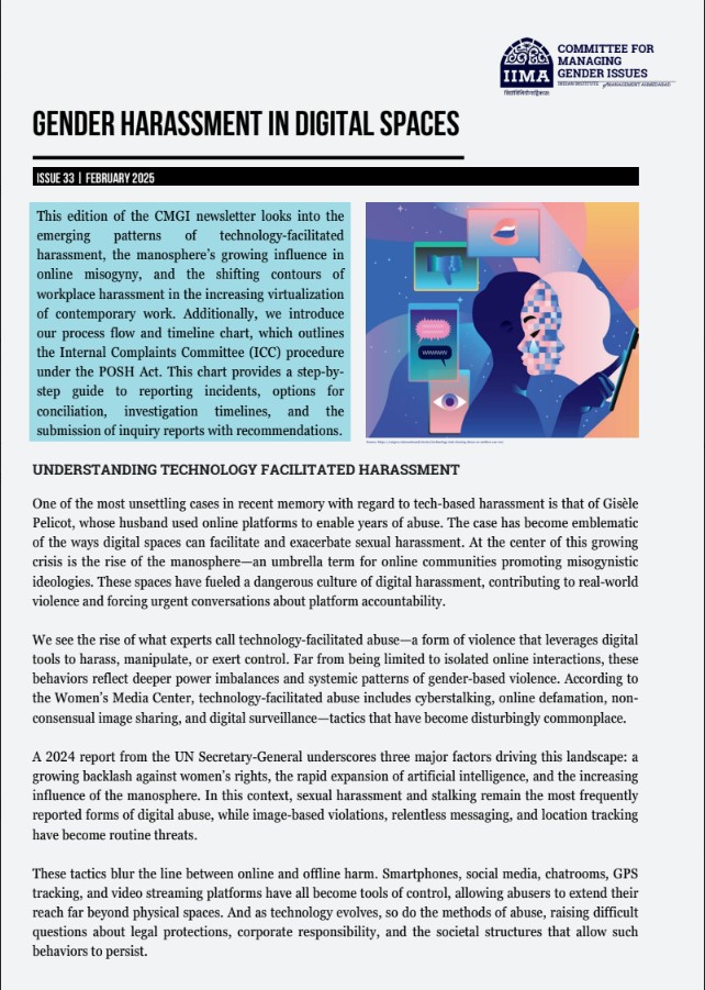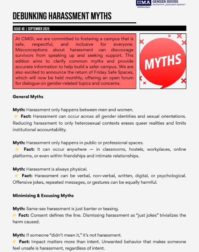 The Indian Institute of Management Ahmedabad (“IIMA”) has set up an Internal Committee known as the Committee for Managing Gender Issues (“CMGI”) in accordance with the Sexual Harassment of Women at Workplace (Prevention, Prohibition and Redressal) Act and Rules, 2013 and regulations applicable to higher educational and technical institutions. The objective of CMGI goes beyond what is mandated by the Act and rules: CMGI is not only confined to dealing with complaints of Sexual Harassment faced by women but also members of other genders. CMGI is committed to creating awareness and sensitization within the community regarding various forms of Sexual Harassment.